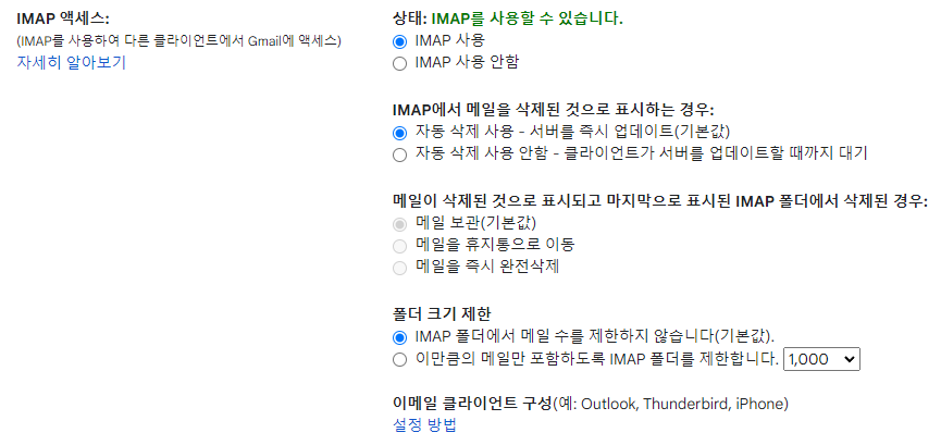 gmail설정에 가서 아래와같이 IMAP를 사용할 수 있게하고