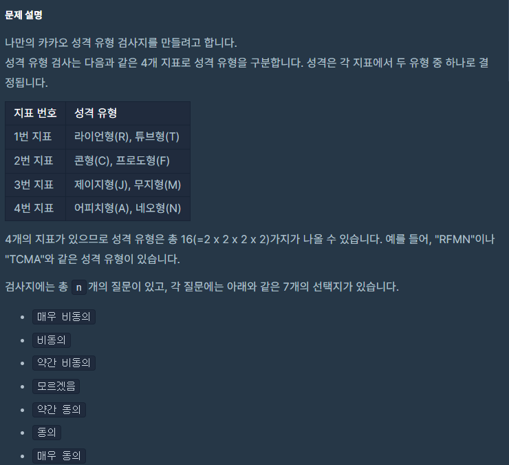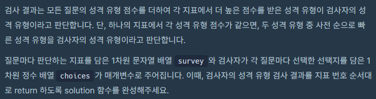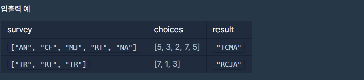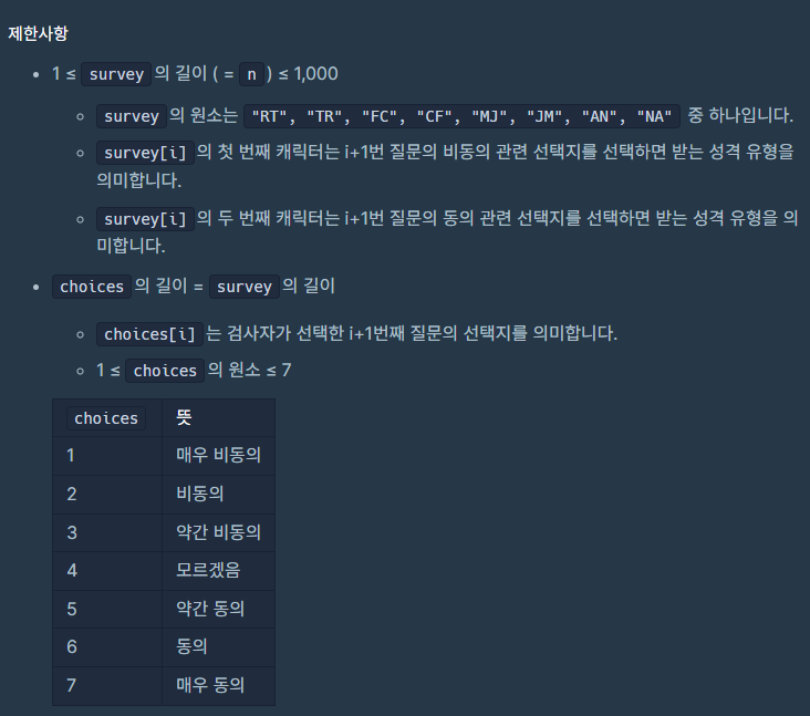 성격의 묶음을 for문으로 돌려서 answer에 += 하는 방식으로 문제를 풀었습니다
