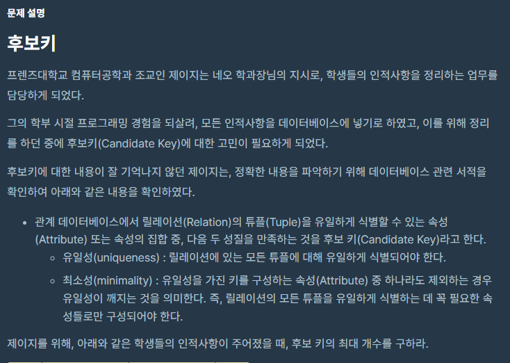 효율적으로 후보 키를 찾기 위해 모든 속성의 조합을 만들고, 각 조합이 위 두 조건을 만족하는지 확인해야 합니다. 여기서는 비트마스크를 사용해 각 속성 조합을 빠르게 생성하고 확인하는 방식을 사용합니다.
